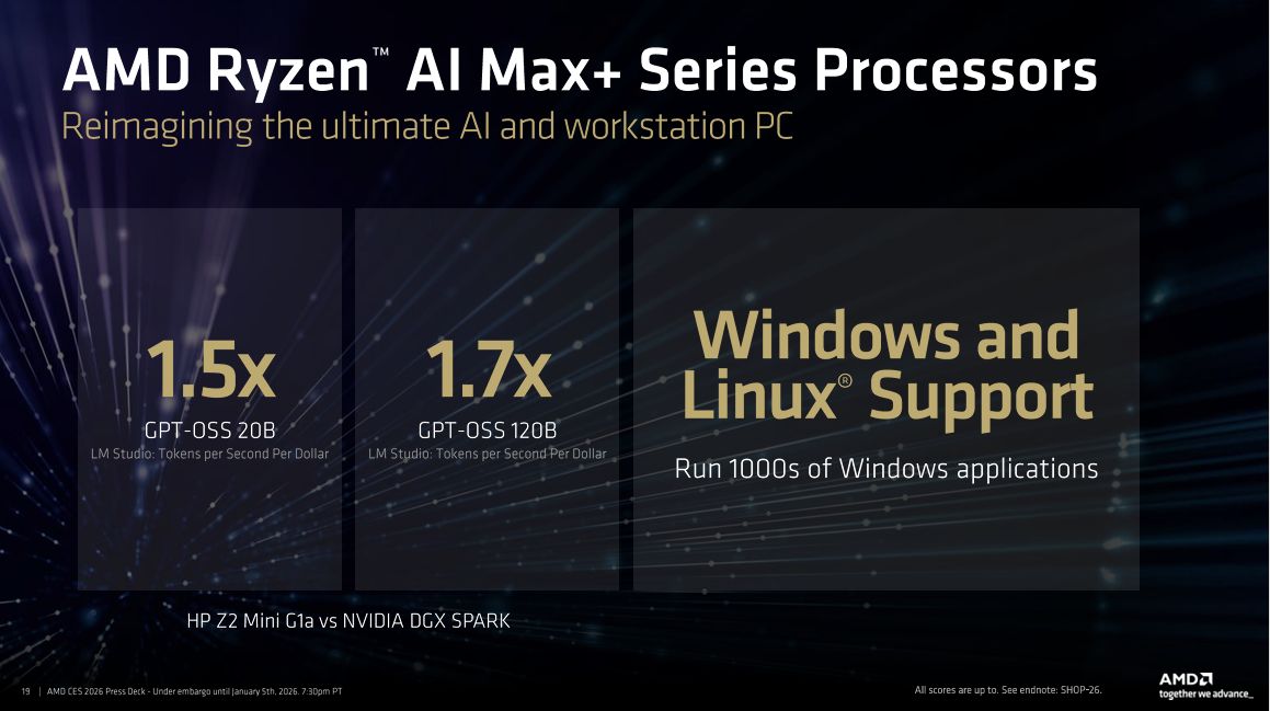 在场景化表现上,锐龙AI Max+ 395对比英伟达DGX Spark,在GPT-OSS 20B/120B大模型测试中,“每秒每美元Tokens数”分别提升1.5倍与1.7倍,且同时支持Windows与Linux双系统,兼容数千款专业软件。
