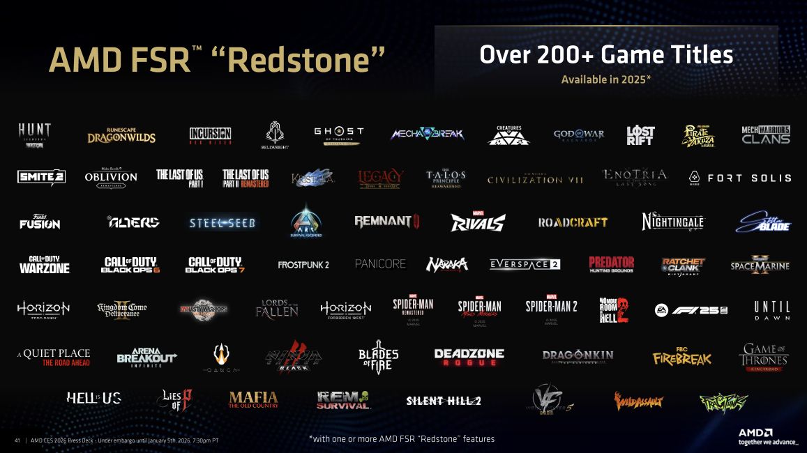 配合此前发布的FSR Redstone技术,AMD形成“硬件+软件”的游戏体验闭环。FSR Redstone通过机器学习赋能,实现“光追与高帧率兼得”,在《使命召唤:黑色行动7》中,4K+光追场景下帧率较原生模式提升4.7倍,目前已有超过200款游戏支持该技术,2026年还将有更多3A大作加入。