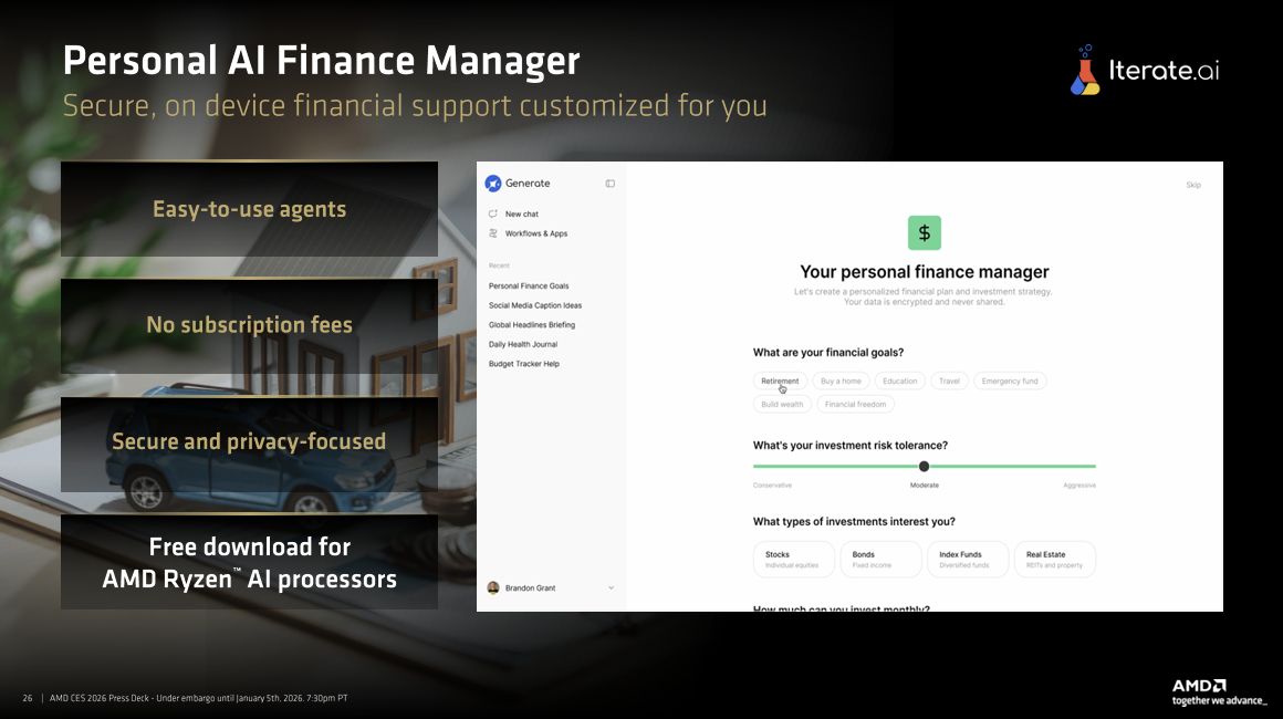 同时,AMD通过生态合作落地AI应用场景:与Liquid AI合作的本地大模型,打破云端AI的字符限制与网络依赖,离线状态下仍能提供接近云端的响应速度;与Iterate.ai联合开发的财务智能体,可本地处理银行信息、税单等敏感数据,保障隐私安全;在医疗场景中,定制化AI智能体可自动完成预约调度、账单处理,将医生从文书工作中解放。