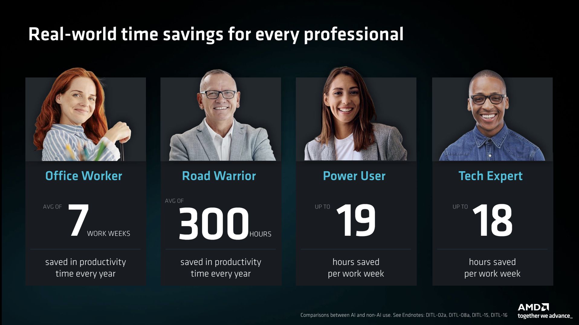 第三方测试数据显示,AI PC能为不同职业人群带来显著的效率提升:普通办公室员工每年可节省7个工作周的生产力时间,移动办公人群年节省时长达300小时,专业电力用户和技术专家每周更是能分别节省19小时、18小时,这也印证了AMD锐龙AI PRO 400系列移动处理器在实际工作中的价值。同时,该系列移动处理器还通过了独立软件供应商(ISV)验证,能充分调动CPU、NPU和GPU的全部算力,轻松应对工程设计、内容创作等高强度专业工作负载,为移动工作站提供强劲且稳定的动力支撑。