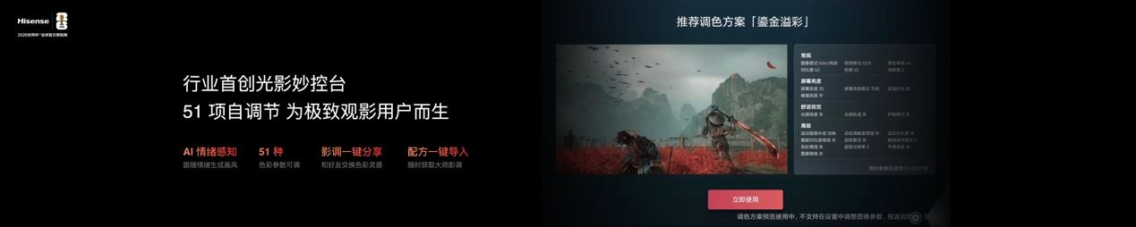 软硬件的深度协同,让海信E7S Pro适配多元使用场景,满足不同用户的个性化需求。针对影音发烧友,产品搭载行业首创的光影妙控台,开放51维色彩参数精细调节,支持AI视觉心理测试自动匹配调色风格,内置多位观影大咖的专业调色方案,一键即可复刻影院级画质,调出的专属风格还能生成方案码分享;炫彩刮削海报墙可直接读取NAS、网盘、USB中的影视资源,秒级刮削封面与简介,AI智能分类让影库井井有条。游戏模式下,电视可秒级识别主机设备,自动切换最优图像参数,独家分屏功能实现“边打游戏,边看攻略”,四路CEC联动让一个遥控器即可掌控所有设备,操作更便捷。此外,产品还支持Dolby Vision 2、Wi-Fi 6、LE Audio蓝牙低功耗音频等前沿技术,配备4GB+64GB超大存储,全方位覆盖观影、游戏、办公等生活场景。