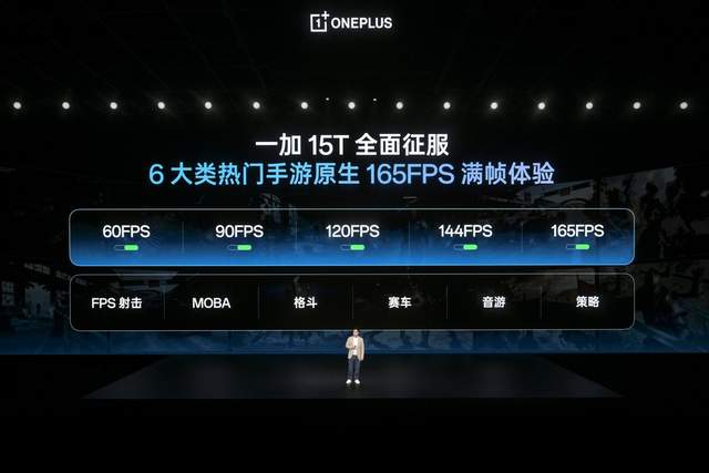 在第五代骁龙 8 至尊版移动平台与独家自研芯片级游戏技术新一代「风驰游戏内核」加持下,一加 15T 成为小屏手机中唯一支持 165 超高帧游戏体验的产品。相比普通 120 帧,165 超高帧每秒可多输出 45 帧画面,显示速度提升 27%,操作响应时间缩短 10ms,操控速度提升 17%,能够助力用户在瞬息万变的对战中更快捕捉敌人信息,获得更大竞技优势。一加 15T 支持《和平精英》、《三角洲行动》等主流 FPS 射击类游戏原生 165 超高帧模式,同时支持MOBA、格斗、赛车、音游、策略共六大类热门手游原生 165 帧超高帧率,引领小屏手机游戏体验进入超高帧时代。