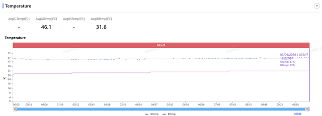 散热系统也表现可圈可点,软件监测其内部电池温度也才33℃,握持时不会有明显“烫手”感,整体散热均匀性不错。