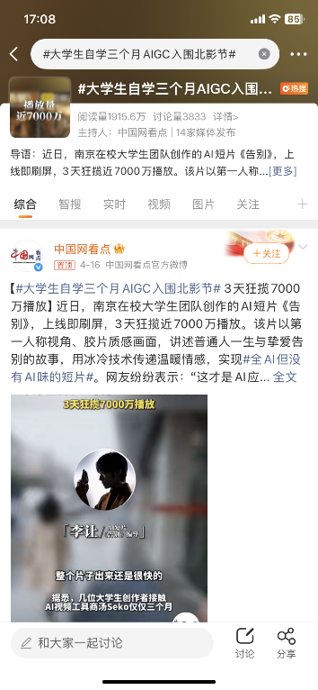 消息一出,影视圈里都在聊一个问题:AIGC的下半场,到底比的是什么?《告别》给出了一个答案。这群年轻人把AI当成观察世界的“眼睛”,去捕捉平凡生活里闪光的瞬间,他们用AI讲好了人心里最软的那个故事。