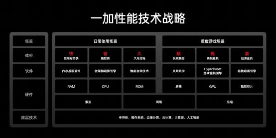 一加 Ace 2 Pro 不仅是天工散热系统的首发机型,也是一加性能技术战略下的首款产品。一加借助对用户“日常使用”、“重度游戏”两大场景性能需求的深度洞察,整合“内存基因重组”、“微架构超算引擎”、“焕新存储技术”、“灵犀触控”、“HyperBoost 游戏稳帧引擎”和“超帧超画引擎”六大技术,形成“流畅铁三角”和“游戏铁三角”;并以此为核心,进一步整合硬件以及软件领域的各项子技术,针对用户日常使用和重度游戏两大场景,打造快、省、久、顺、稳、清的极致体验。