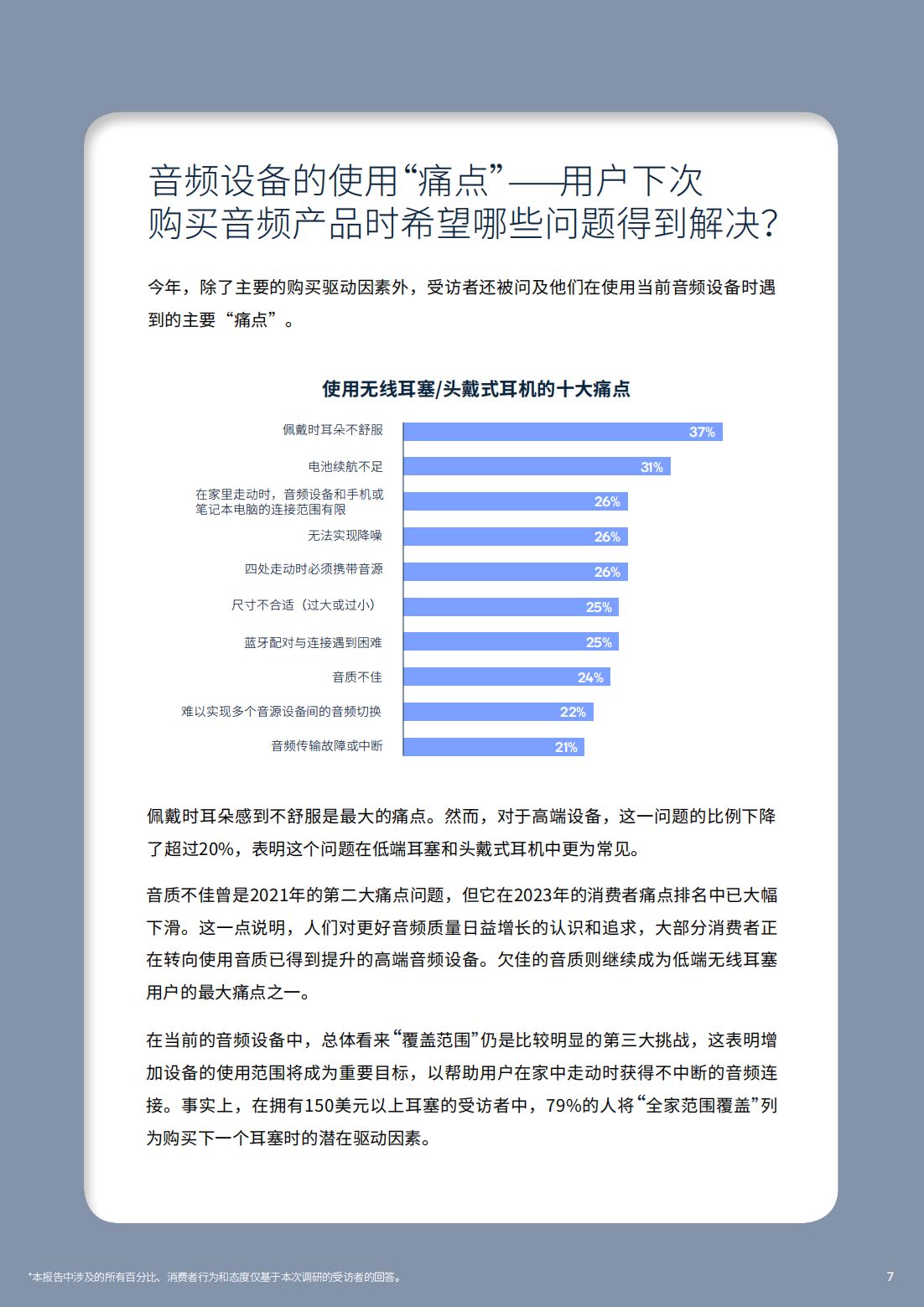 在被问及使用当前音频设备遇到的主要“痛点”时,37%的受访者表示佩戴时“耳朵感到不舒服”成为最大的痛点;