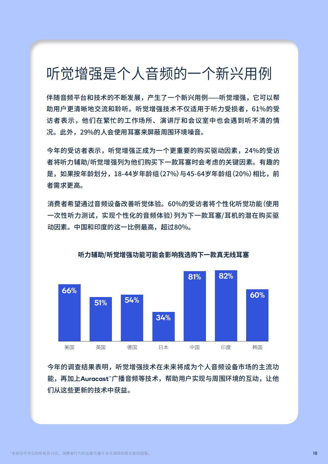 纵观当前市场上的音频设备,“覆盖范围”被列为第三大痛点。“更大的设备覆盖范围”(62%)成为仅次于“更长的电池续航时间”(70%)吸引消费者购买无线耳机的功能。此外,79%的高端设备用户将“全家范围覆盖”列为购买下一款耳塞的潜在驱动因素。