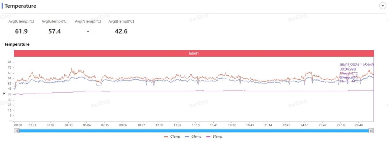 温度这边,半小时游戏后,不但手机背部和中框没有感觉到明显的发热,手机的内部电池温度也被控制在了44℃左右。从图形可以看出,温度并没有随着游戏时间的增加,呈现持续走高的态势,这证明了iQOO Neo9S Pro+在炎夏面对热门手游,也是绰绰有余的。