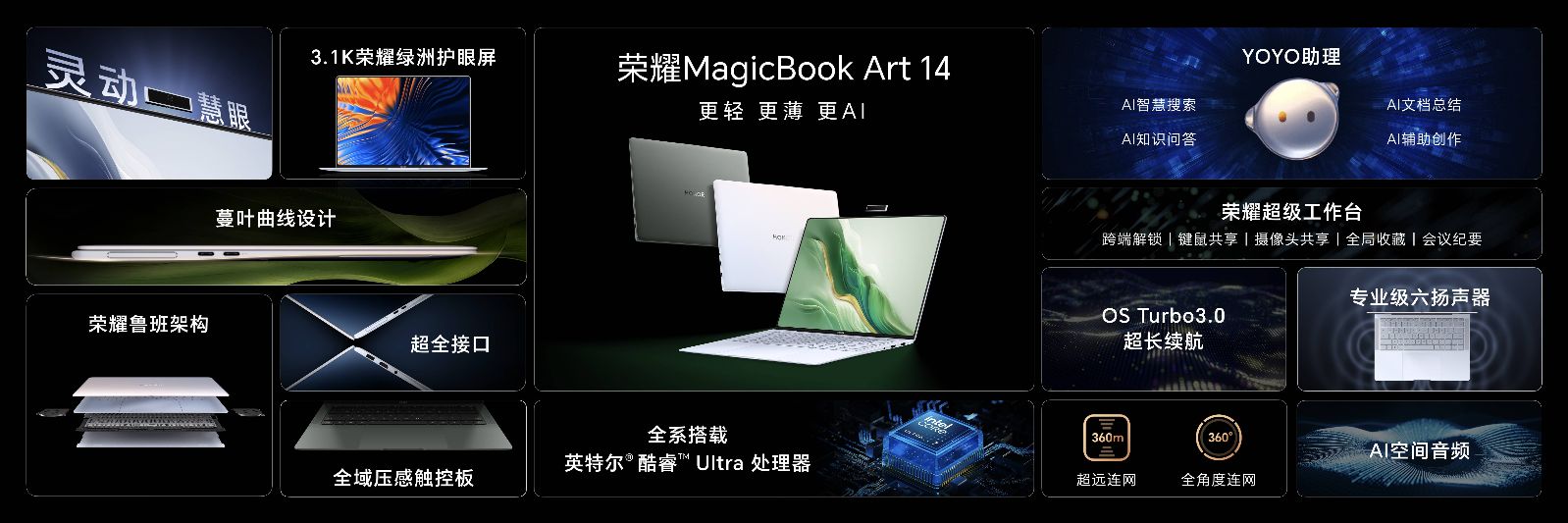 荣耀笔记本也迎来了旗舰新成员——荣耀MagicBook Art 14。作为全新的高端超轻薄AI PC,荣耀MagicBook Art 14与荣耀Magic V3同样采用荣耀鲁班架构,包含航天级创新材料及创新架构设计,带来薄约1cm、轻至1.03kg的超轻薄机身,突破技术极限薄出新高度;荣耀MagicBook Art 14首创磁吸式灵动慧眼摄像头设计,带来14.6英寸3.1K OLED触控好屏和PC行业最高的97%屏占比,并支持4320Hz超高频PWM零风险调光和荣耀绿洲护眼技术,通过多重权威护眼认证,引领PC行业护眼标准。