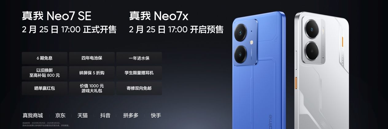 - Neo系列千元战略新品——真我Neo7x。首发第四代骁龙6,同时配备6000mAh泰坦电池和IP69满级防水。真我Neo7x将于2月25日17:00全渠道开启预售,首销价1299元起,国补到手价仅1105元起;