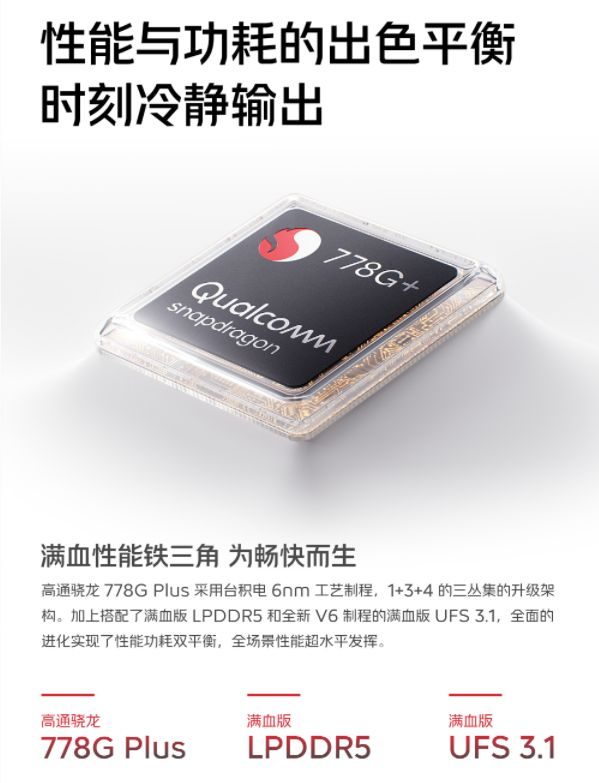 官方透露的消息显示,iQOO Z6将搭载台积电6nm工艺制程的高通骁龙778G Plus处理器,该处理器采用1+3+4的三丛集架构。同时,该机型还将配备满血版的LPDDR5和满血版UFS 3.1,组成新的满血性能铁三角。