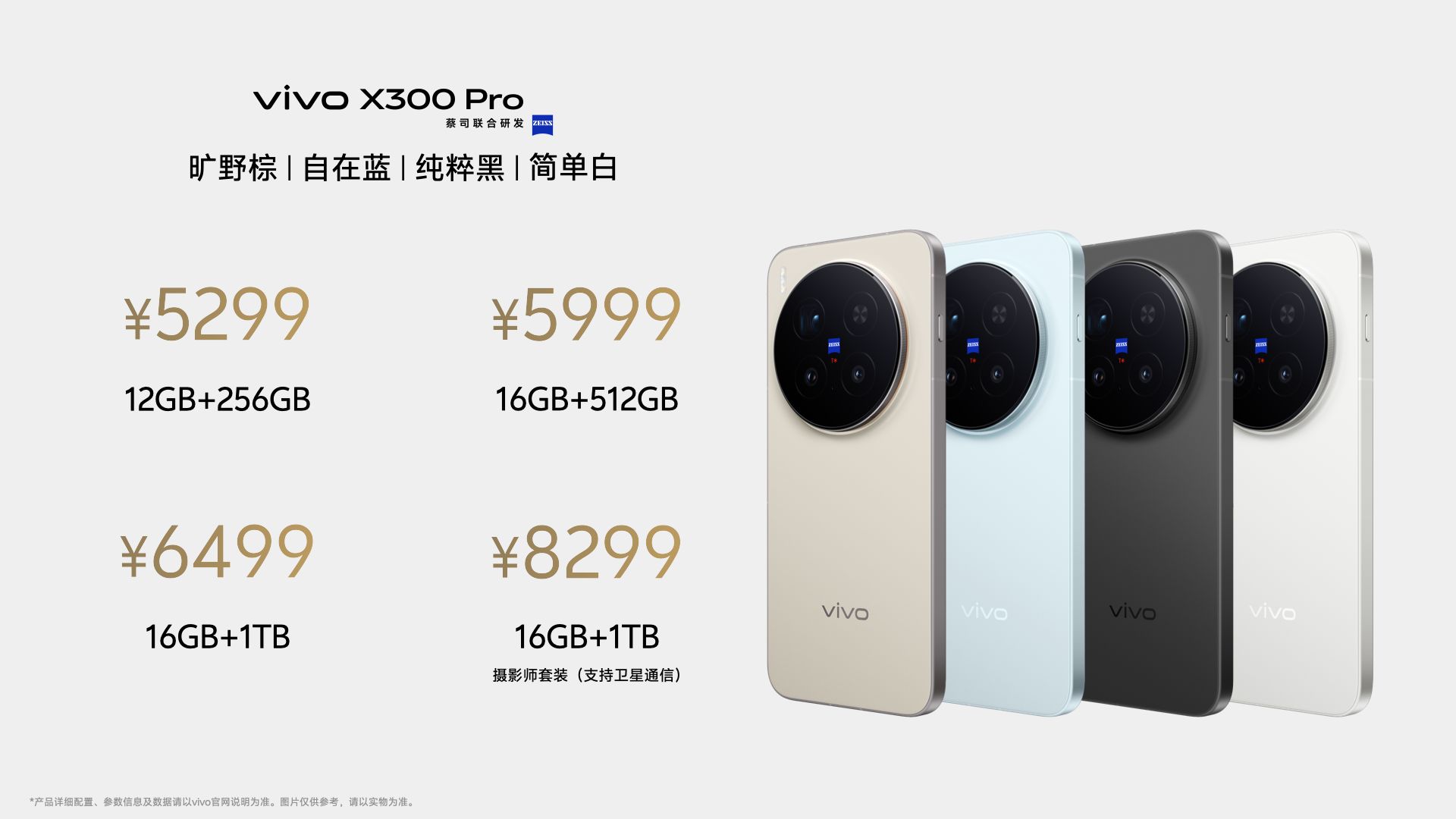 vivo X300 Pro提供12GB+256GB、16GB+512GB、16GB+1TB、16GB+1TB(卫星通信版)共4个版本,售价分别为5299元、5999元、6499元、8299元。