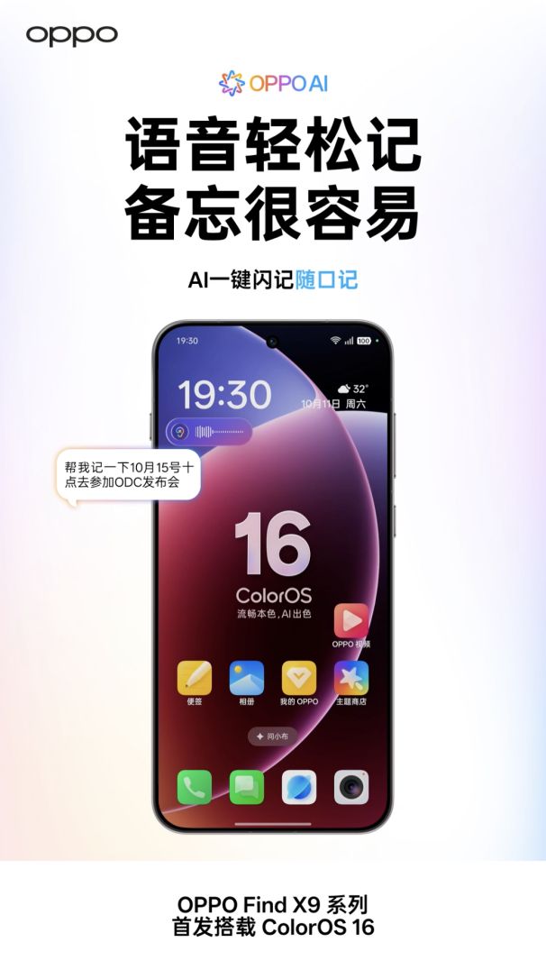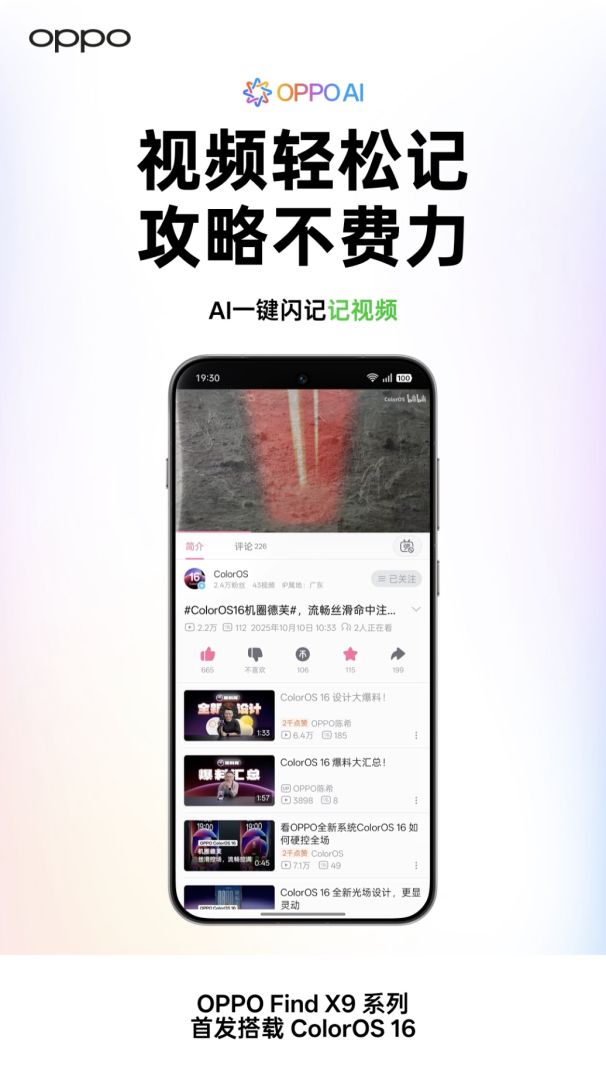 2025 年 10 月 14 日,中国,深圳 —— OPPO 正式官宣「旅拍神器」 Find X9 系列将全球首发搭载 ColorOS 16 系统。新系统 AI 一键闪记重磅升级,不仅记得更深,而且记得更全;跨生态互联也全面升级,手表、耳机、电脑、短信通话互通无阻;一碰互传也全面升级,更快更稳定。