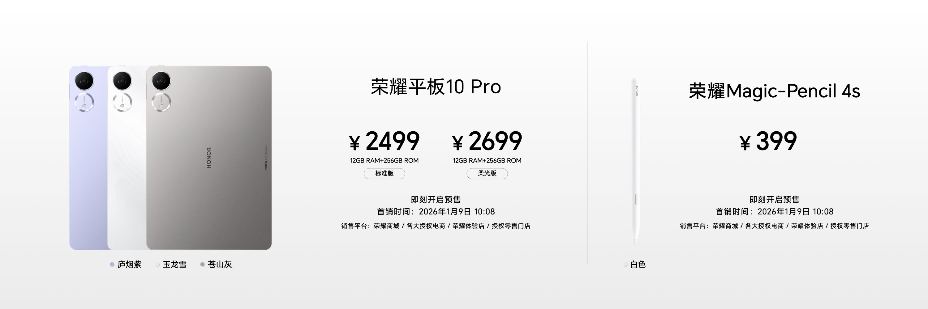 荣耀平板10 Pro于1月9日10:08全渠道正式开售,12GB+256GB标准版售价2499元、12GB+256GB柔光版售价2699元,全新手写笔荣耀Magic-Pencil 4s售价399元;此次将所有配置都升级为新春礼盒套装,12GB+256GB礼盒版现价2499元,12GB+256GB柔光礼盒版现价2699元,购买即赠荣耀Magic-Pencil 4s手写笔;荣耀平板X10 Pro于1月9日10:08全渠道正式开售,8GB+128GB版本售价1499元、8GB+256GB版本售价1699元、8GB+256GB柔光版售价1899元。