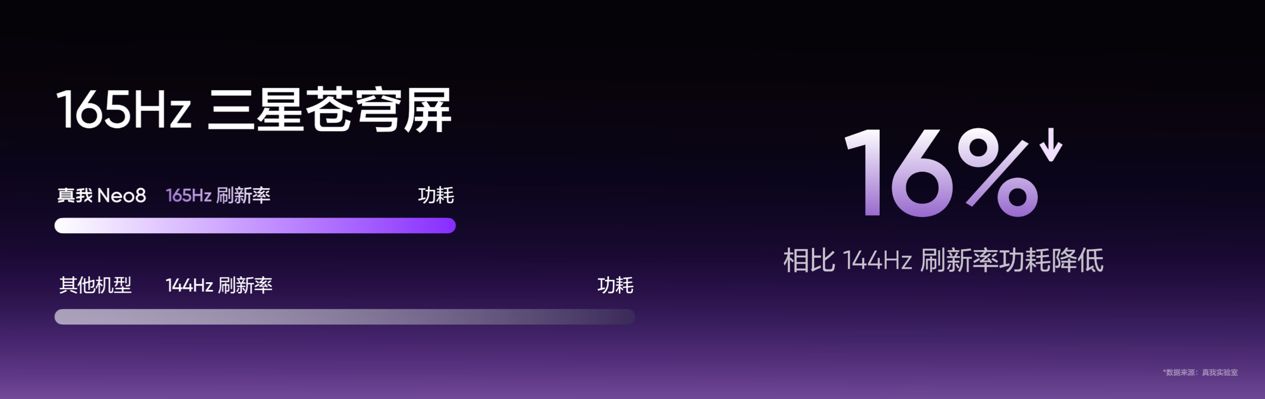 极致性能需要顶级屏幕来呈现。真我Neo8携手三星显示全球首发165Hz三星苍穹屏,采用M14旗舰发光材料,发光能效提升26%,165Hz功耗相比行业144Hz降低16%。