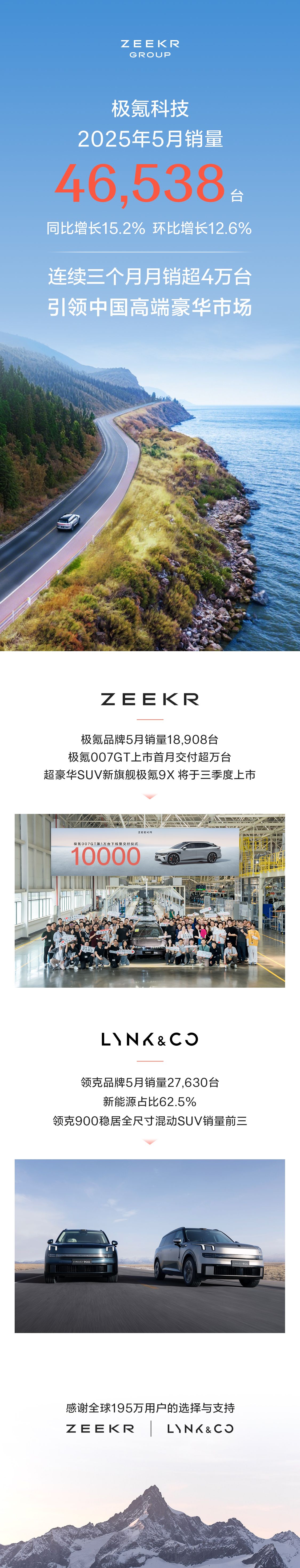 2025年6月1日,极氪科技公布最新销量数据:5月极氪科技销量46,538台,同比增长15.2%,环比增长12.6%,同环比双增长,连续三个月月销超4万台,持续引领中国高端豪华市场。其中,极氪定位于全球豪华科技品牌,销量18,908台,领克定位于全球新能源高端品牌,销量27,630台,新能源占比62.5%。
