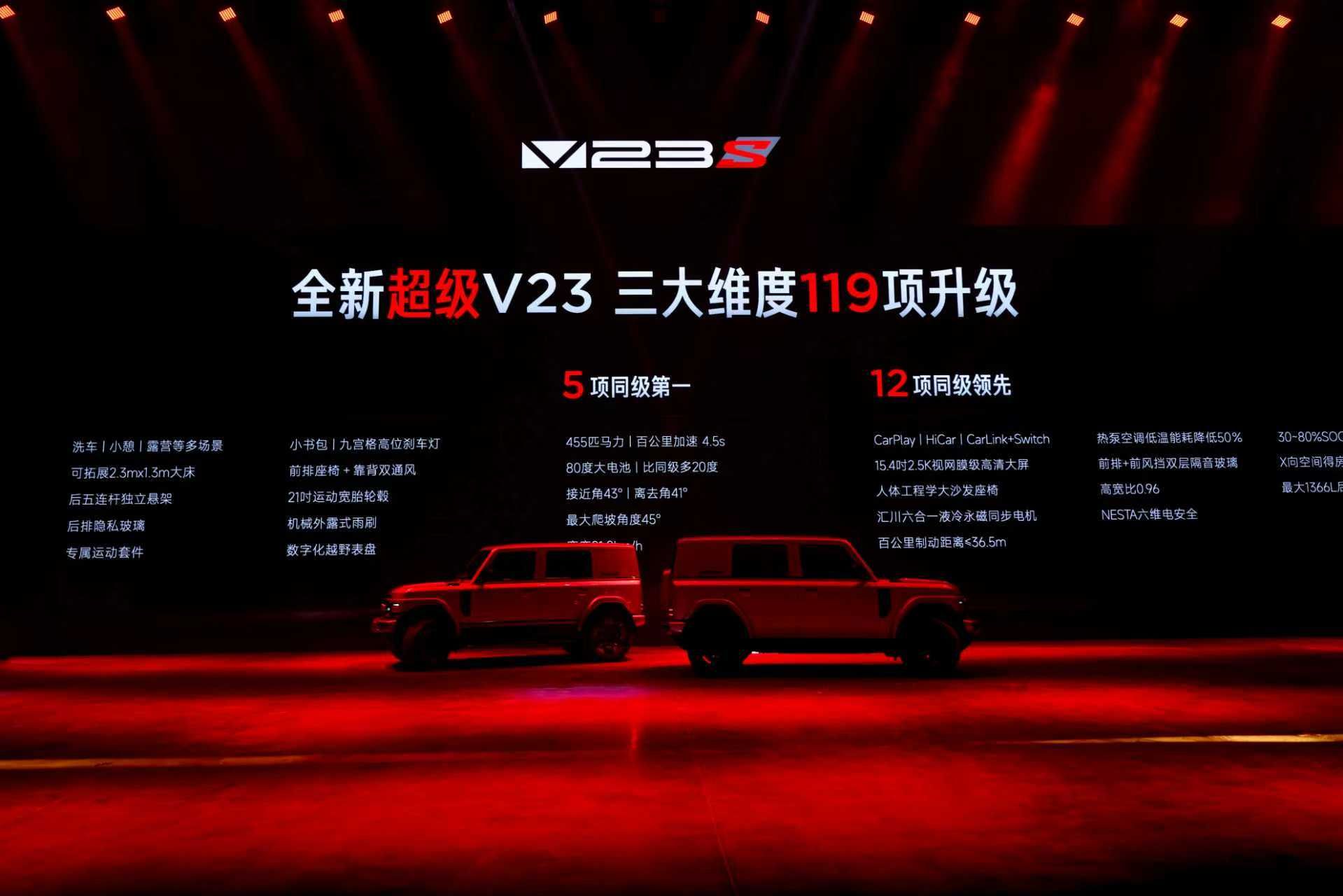 9月21日,“玩出强大”iCAR V23超级之夜在芜湖盛大举行,iCAR全新超级V23家族正式上市,共推出401超级运动版、550超级运动版以及超级V23S 501巅峰性能版三个版型,官方指导价12.28万元至15.48万元。首次推出超级V23S版车型,正式开启高性能子序列,专属运动徽标,极致性能表现,树立方盒子品类价值体验新标杆。超级V23赛博版同期开售,官方指导价15.88万元和17.48万元。