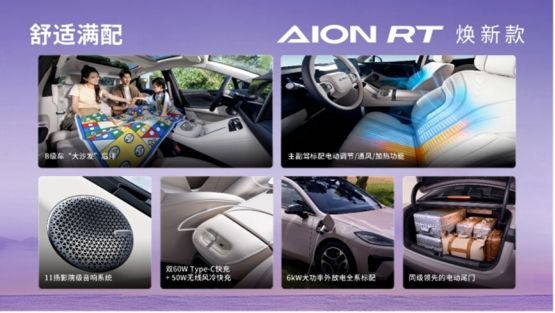 家庭全员的乘坐舒适性,是一款优秀家轿的基操。AION RT 焕新款不仅全系标配豪华多层皮质座椅、双区恒温双层流空调等,还是同级唯一前排主副驾座椅均标配电动调节、通风、加热功能的车型,冬暖夏凉四季清爽——要知道,这个级别能给电调就已属难得;同级领先的B级大后排,拥有943mm腿部空间与320mm最高坐姿,加上接近95°的躯干角设计,让后排乘客不用坐“小板凳”,长途乘坐也不累。同时,奔驰C级同款的双电动遮阳帘可有效阻隔紫外线,11扬声器影院级音响系统则带来沉浸式听觉享受,还有同级领先的电动尾门,有5种开启模式,方便实用。此外,同级少见的前排50kW无线充电、后排双60W Type-C快充接口,可同时为手机、笔记本电脑等多设备充电,满足现代家庭出行中的多种用电需求,娱乐和工作两不耽误。