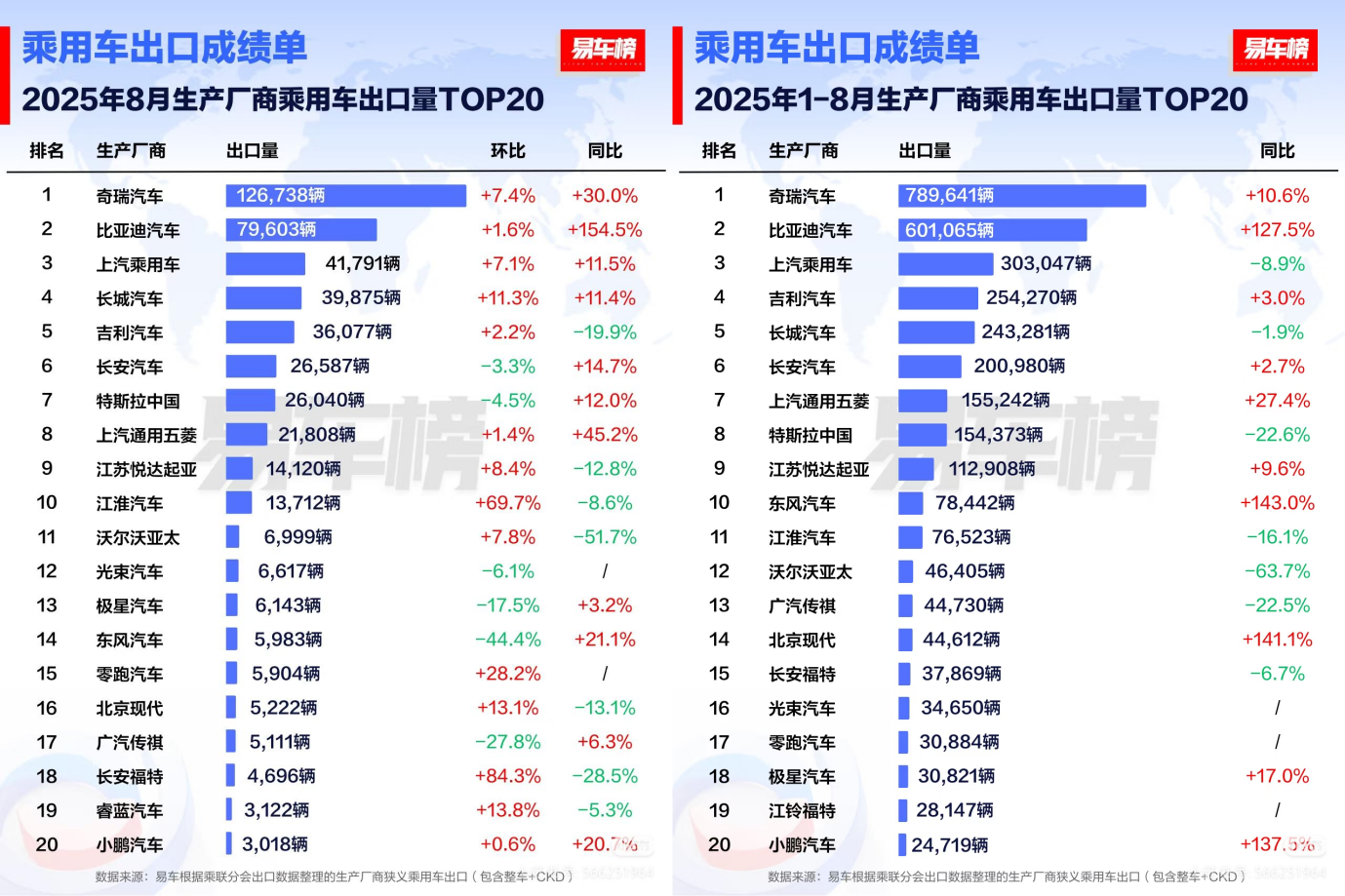 从单月数据来看,8月比亚迪乘用车出口量达79603 辆,环比增长1.6%,这一成绩使其在当月生产厂商出口榜中仅次于奇瑞汽车(126738辆),且大幅领先于排名第三的上汽乘用车(41791 辆)。值得关注的是,比亚迪154.5%的同比增速,远超奇瑞的30.0%、上汽乘用车的11.5%等同行水平,在出口量TOP20厂商中增速排名第一,展现出极强的增长动能。
