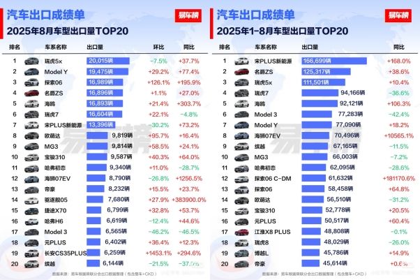 在车型层面,比亚迪明星车型宋PLUS新能源表现尤为亮眼,1-8月累计出口166699辆,直接摘得同期车型出口榜冠军;8月单月,宋PLUS新能源也以13396辆的出口量跻身车型出口TOP20榜单,此外,比亚迪海鸥、海狮07EV、驱逐舰05、元PLUS四款车型也一同进入该榜单,8月共有5款车型上榜,占TOP20榜单的25%,成为上榜车型数量最多的品牌之一。其中,海鸥8月出口16893辆,同比激增303.7%;海狮07EV出口8790 辆,同比增长1256.5%;驱逐舰05出口7680辆,同比增幅更是高达383900.0%,多款车型的爆发式增长,为比亚迪出口总量提供了有力支撑。