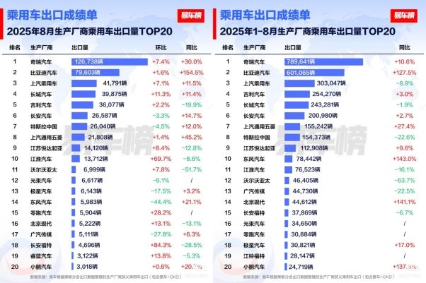 近日,比亚迪出海再秀亮眼成绩。权威汽车媒体易车依据乘联分会出口数据整理发布的乘用车出口榜单显示,8月中国汽车品牌出海表现分化,比亚迪以超7.9万辆的出口量、154.5%的同比增速,在生产厂商乘用车出口量排名中位列第二,增速则稳居第一,成为中国品牌出海的核心领跑者。