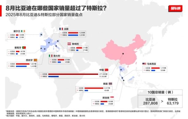在具体市场表现上,比亚迪8月在全球多个关键市场实现对特斯拉的超越。在欧洲市场,法国8月比亚迪销量达1338辆,同比激增792%,超过特斯拉同期的1331辆;西班牙市场比亚迪销量1827辆,同比增长414.6%,同样领先于特斯拉的1435辆;此外,意大利(比亚迪876辆vs特斯拉416辆)、爱尔兰(比亚迪330辆vs特斯拉231辆)、奥地利(比亚迪774辆vs特斯拉270辆)、葡萄牙(比亚迪467辆vs特斯拉233辆)等欧洲国家,比亚迪8月销量均高于特斯拉。在东南亚市场,泰国8月比亚迪销量2517辆,远超特斯拉的464辆;马来西亚市场比亚迪销量1119辆,同样领先于特斯拉的509辆;新加坡市场比亚迪销量920辆,也超过特斯拉的458辆。
