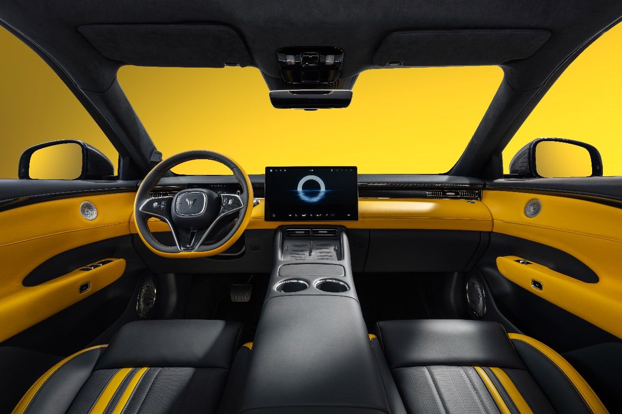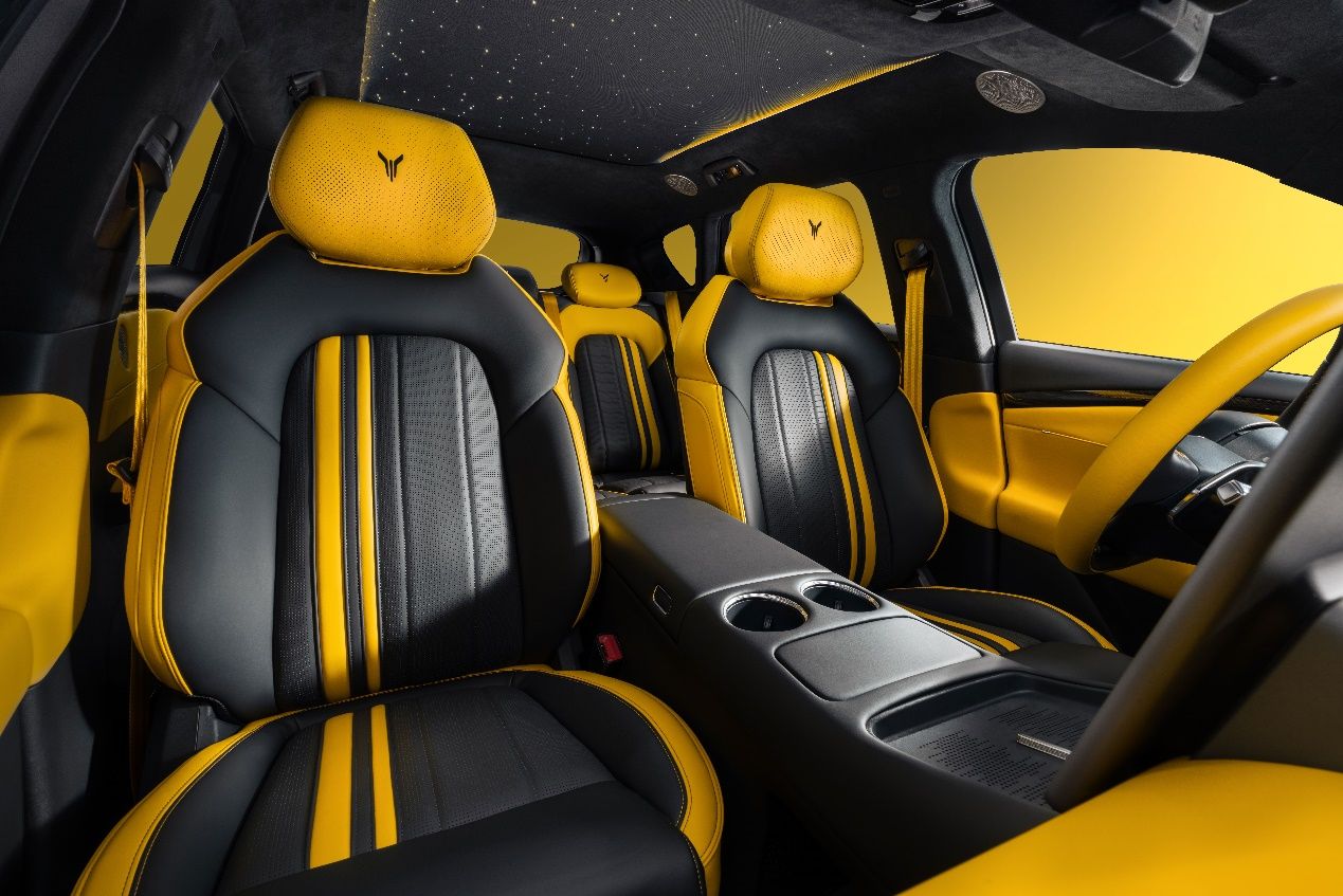 新车内饰延续外观撞色设计,采用玄金双拼撞色内饰,跳脱的对比色瞬间点燃座舱气氛,激发驾驶欲望。仪表台、门护板、方向盘、座椅等关键区域均有黄色超纤包覆,与A/B/C柱及顶棚的仿麂皮材质,共同营造出激情、豪华的内饰氛围。升级定制的NAPPA环抱式运动座椅,精选头层牛皮带来温润细腻的触感,严密的人体工学设计确保在激烈驾驶时提供全方位的支撑与包裹;暗影哑光碳纤维组件覆盖外后视镜、驾驶舱前内饰面板、方向盘等部分,100%真碳纤维丝带来的独特纹理与质感,点亮了座舱的运动豪华气息。