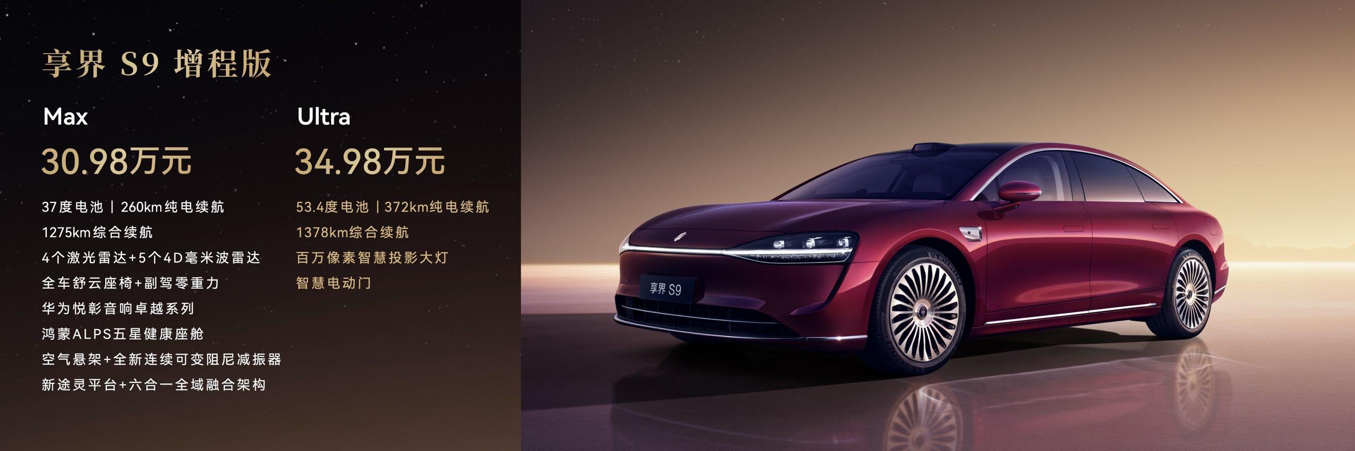 旗舰9系,越境豪华。新车共推出4个版本:享界S9增程版Max售价30.98万元,享界S9增程版Ultra售价34.98万元,享界S9纯电版Max售价32.98万元,享界S9纯电版Ultra售价36.98万元。首销期下定,可享受至高价值60000元权益[26],包括价值至高10000元寰宇红/浩宇蓝 外饰限时免费、价值10000元的零重力座椅抵扣券、价值20000元ADS高阶功能包补贴权益、价值6000元舒享用车大礼包、价值4000元辅助驾驶无忧服务权益、至高10000元的定向选配优惠。首销权益有效期至2025年12月22日 23:59:59,预订权益可叠加,更有至高15000元购置税补贴方案[27]。鸿蒙智行其他车型车主增购/换购新款享界S9享尾款减免20000元。目前,新款享界S9试驾车已陆续进入全国门店,用户可在全国800+线下阵地、鸿蒙智行官网、鸿蒙智行App、华为商城App、我的华为App等官方渠道预约体验试驾。