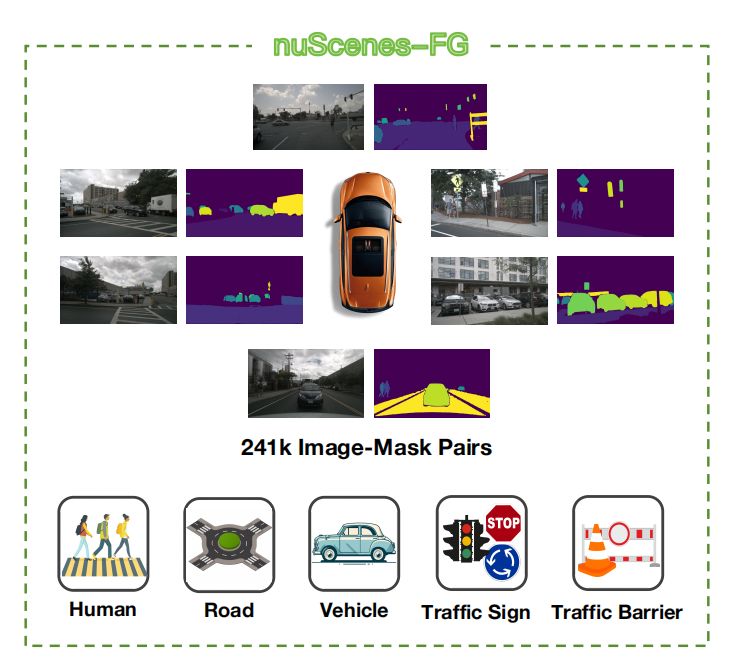 - 我们构建了nuScenes-FG数据集,包含针对自动驾驶场景的前景分割标注,总计包含24.1万个图像-掩码对。