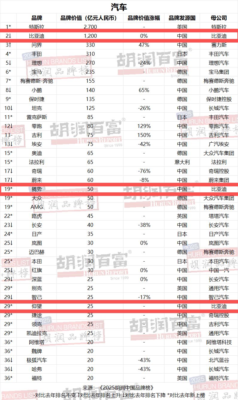 比亚迪4连冠!2025胡润汽车品牌榜出炉,首次纳入非国产品牌