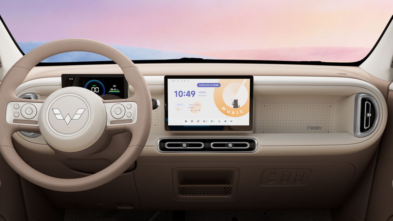 第五代宏光MINIEV内饰设计简约中藏巧思,圆润中见秩序,在细节处展现出精致复古和简约时尚的趣味融合。新车升级为同级领先的怀挡设计,搭配多功能方向盘及10.1英寸中控屏,大幅提升驾驶安全性与便利性。“环扣交融”门饰板、“灵动岛”式一体化副仪表台等设计均采用环形元素设计巧思,环环相扣,搭配“星钻流光”镀铬饰条,将艺术观感和实用储物完美结合;全新升级的棕白格趣座椅质感舒适性全面提升,前排座椅靠背向后放倒最大可达164°,随时都可休息小憩。