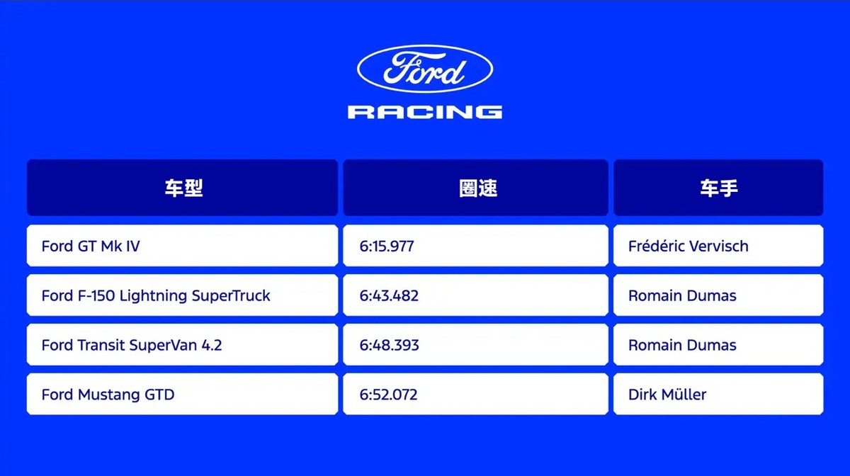 此番挑战过后,福特GT Mk IV在纽博格林北环的圈速超过了雪佛兰科尔维特ZR1X(同属于原型车类别),成为纽北最快的美国原厂车。事实上,福特GT Mk IV目前是纽北所有车辆(包括赛车和纯电动原型车)中圈速第三快的车型。