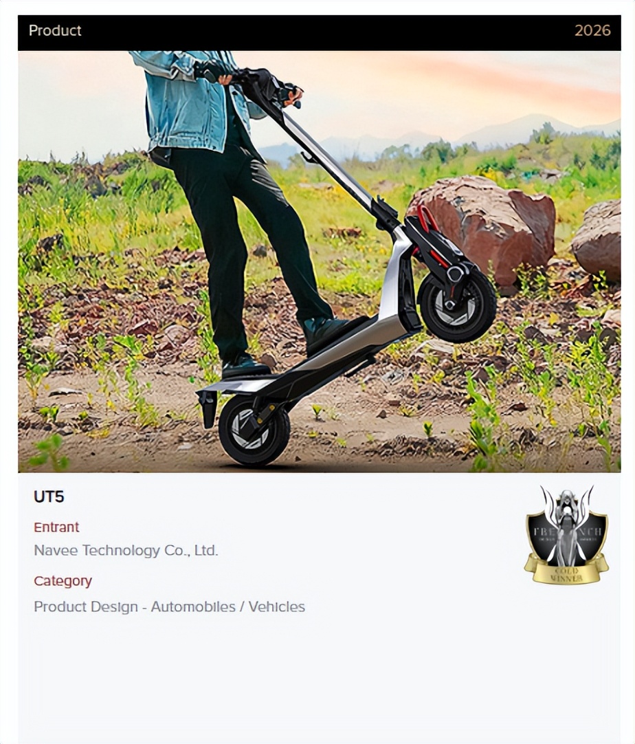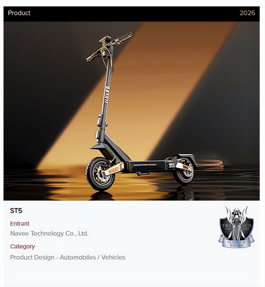 2026年3月,全球工业设计领域殿堂级赛事、国际设计趋势权威风向标法国设计奖(French Design Awards, FDA)正式公布年度获奖名单,全球智能户外生态出行品牌坦途科技NAVEE再创行业纪录,旗下ST5、XT5、NT5、UT5四款电动滑板车全线获奖,其中ST5、XT5斩获赛事最高荣誉铂金奖,NT5、UT5荣获金奖,成为本届赛事短交通领域唯一实现“双铂双金”大满贯的品牌。