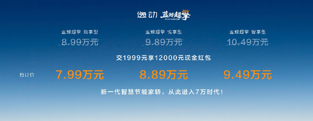 第四代逸动蓝鲸超擎发布抢订价:交1999元享12000元现金红包,蓝鲸超擎劲享型抢订价7.99万元、蓝鲸超擎悦享型抢订价8.89万元、蓝鲸超擎智享型抢订价9.49万元。购全系车型用户可享五大限时购车权益:置换礼:置换至高7000元(本品4000元,非本品2000元,长安逸动系列老客户限时叠加3000元补贴);金融礼:4万24期0息、0首付、5年低息超长贷;保养礼:限时赠送3年或6次基础保养;质保礼:首任非营运车主HEV混动系统核心部件终身质保;流量礼:基础流量免费,娱乐流量3年免费(6G/月)。