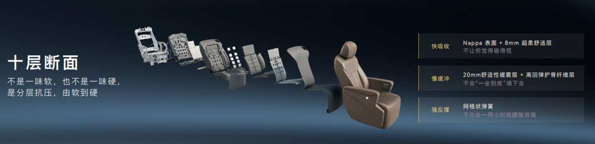 舒享性上,泰岳平台把MPV做成用户家里最舒服、最享受的房间。该平台首次针对中国老人,做了一套专门的座椅舒适性断面设计和结构设计,并且科学、细致地做了十层断面,从身体接触到承托,实现由软到硬的无感过度,让用户切实感受到每一处都被稳稳接住。同时,针对有孩家庭,专门打造了“晕车舒缓模式”,把整车的加速曲线、制动曲线、悬架阻尼等,统一做了平衡最优解。