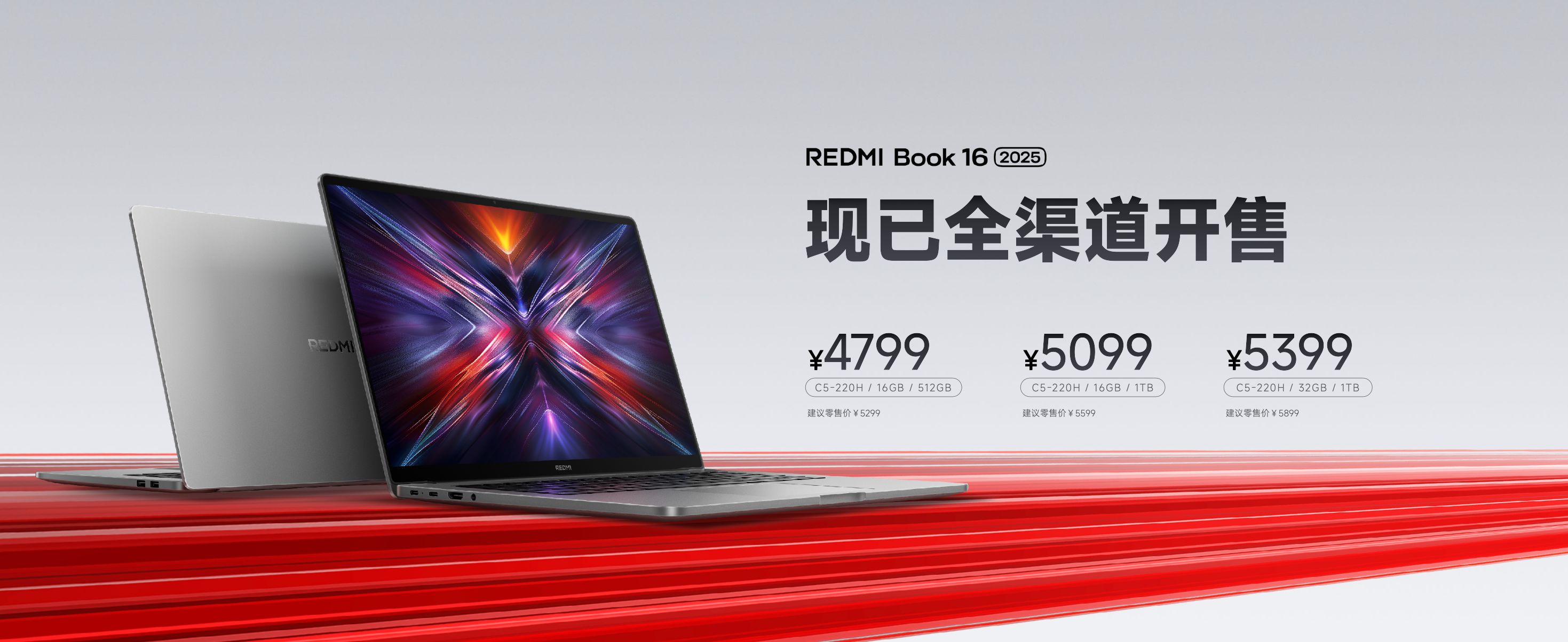定位大屏便携满血性能轻薄本,集轻薄、性能、续航三长板的REDMI Book 16 2025现已全渠道开售,有3个配置可选,C5-220H/16GB/512GB配置首销价4799元,C5-220H/16GB/1TB配置首销价5099元,C5-220H/32GB/1TB配置首销价5399元。