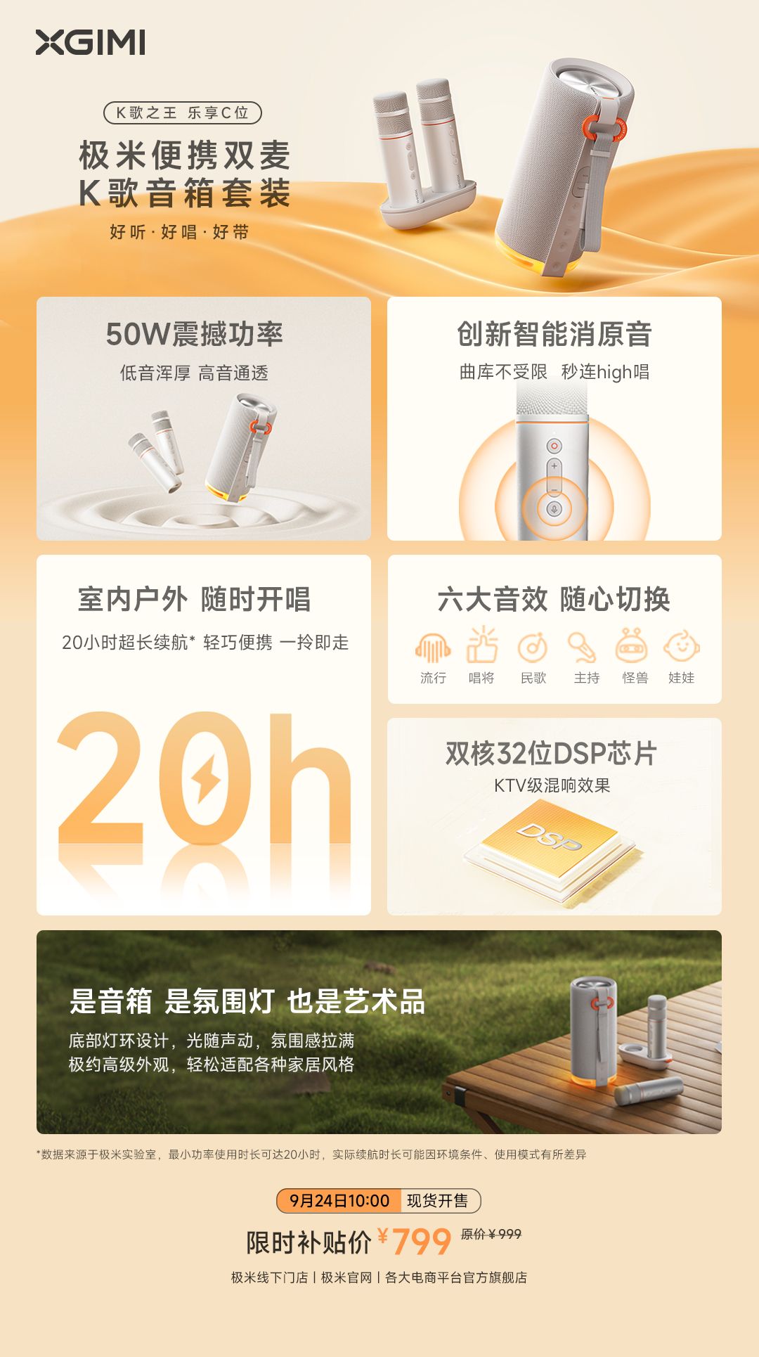 9月24日,极米全新音乐配件单品——极米便携双麦K歌音箱套装全平台正式上线。新品首发价999元,限时补贴价799元。套装内含蓝牙音箱、无线麦克风及麦克风专用充电底座,轻松满足双人合唱及多种娱乐场景。同步发售蓝牙音箱单品,原价749元,限时补贴价599元。作为行业首创搭载创新智能消原音技术的音乐单品,该产品不仅拓展了极米配件产品线,更是其布局“影音娱乐生态”的重要战略举措。