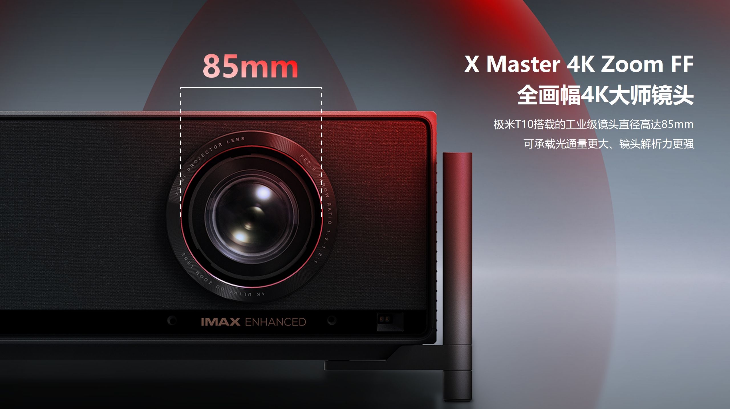 镜头方面,T10采用全链路自主研发的直径达85mm全画幅4K大师镜头,支持1.5倍光学变焦和双向光学移轴。在光学设计中,极米通过复杂的公式推导与软件、结构联动,确保在不同移轴条件下仍能保持高解析度,同时通过热补偿措施解决了高流明机器在高温环境下的失焦问题。同时,T10还解决了高亮度下的散热与防尘难题,让光路系统传输效率达到85%以上。