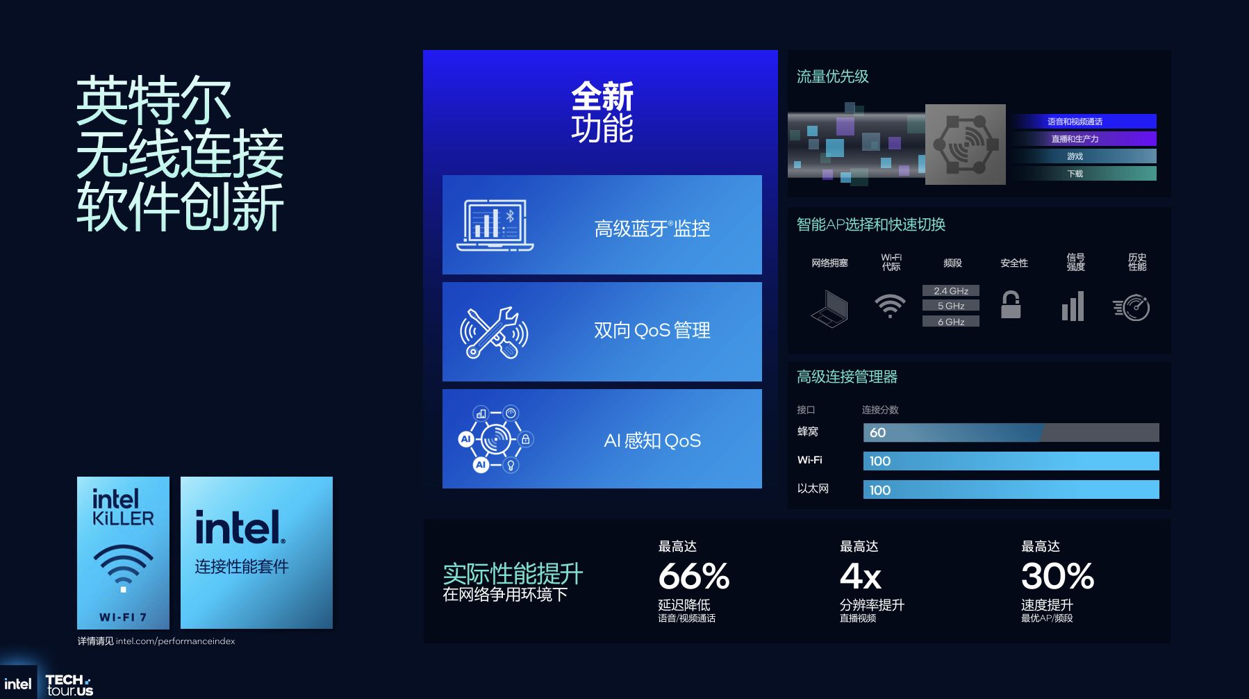 无线方面,该处理器集成英特尔Wi-Fi 7 R2(BE211 CRF 模块,代号 Killer 1775)与蓝牙Core 6.0,支持5GHz/6GHz双频段,信道带宽最高达320MHz,较Wi-Fi 6/6E翻倍;新增多链路重配置、限定TWT、单链路eMLSR等功能,可动态分配网络资源,降低延迟的同时节省功耗。蓝牙6.0则支持 LE 音频,功耗降低50%,并实现Auracast广播音频与10cm精度的 “查找我的设备” 功能,双蓝牙链路设计使通信距离提升至52米,稳定性显著增强。