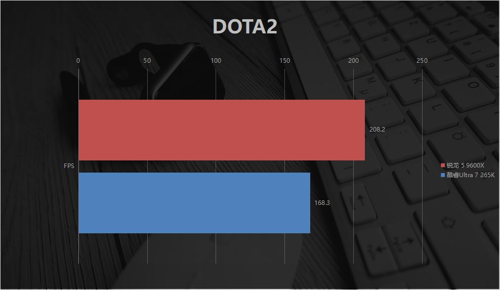 《DOTA2》则是我们测试的5款网游中,两者差距最大的一款,锐龙 5 9600X领先酷睿 Ultra 7 265K的幅度达到了23.71%。