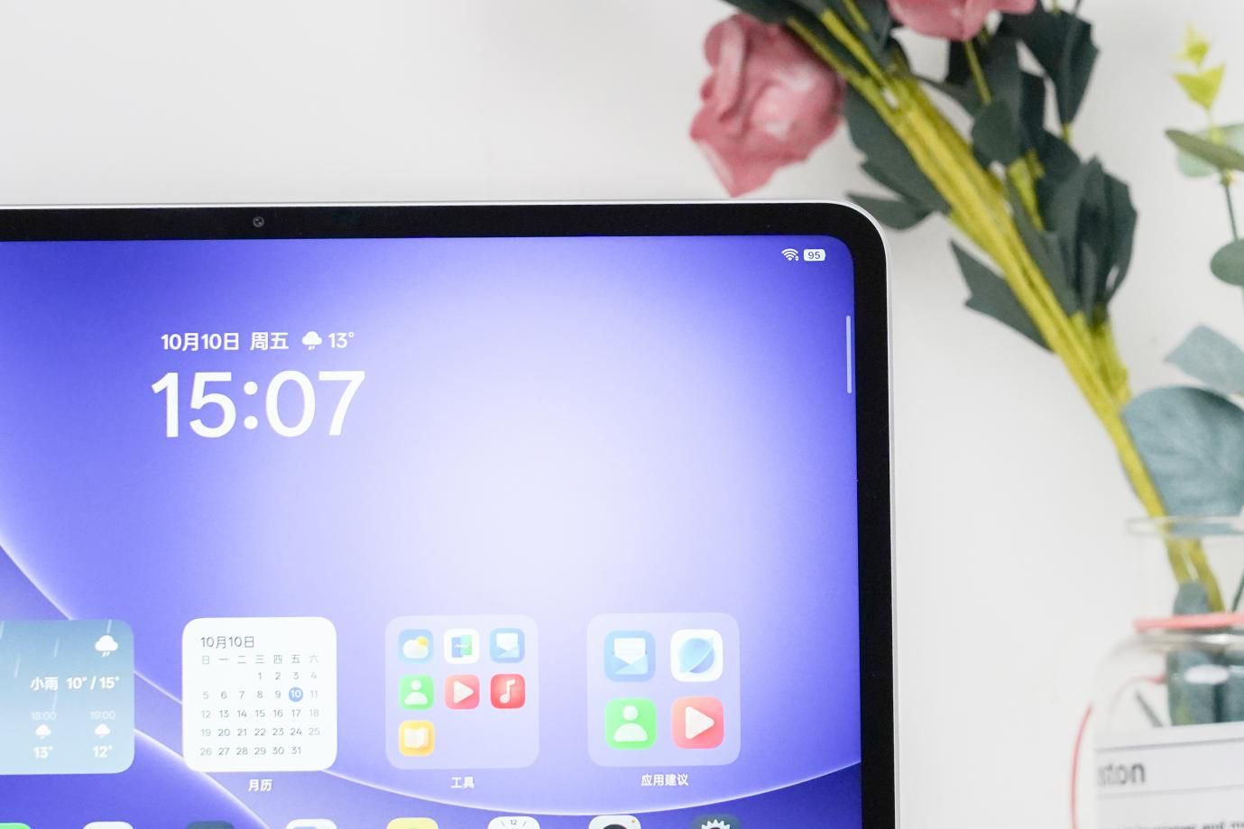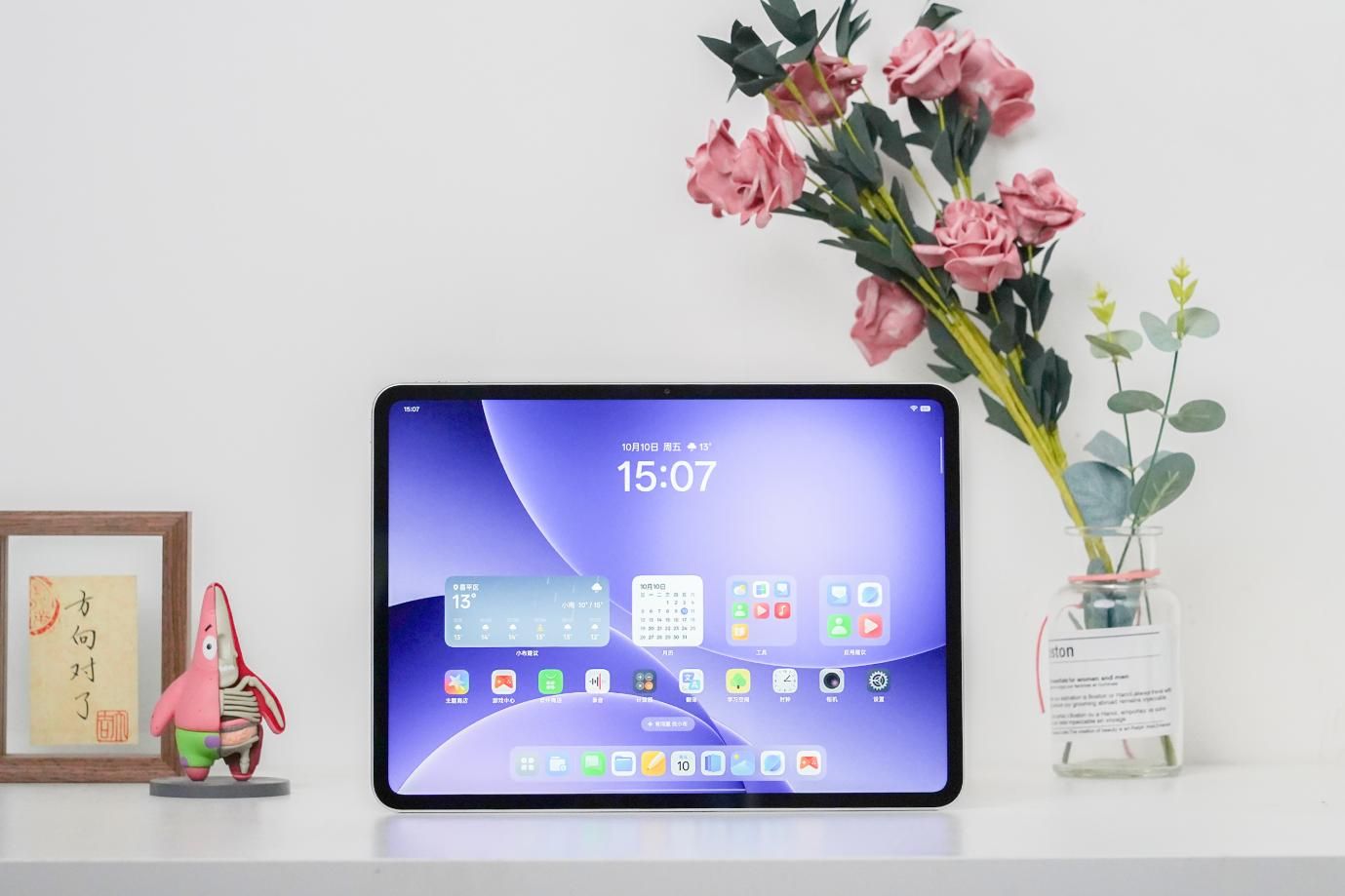 细节设计上,OPPO Pad 5的按键布局简洁合理,电源键与音量键集中在机身右侧,按压反馈清晰;底部则配备了Type-C接口,支持快充与数据传输。最让人惊喜的是其“灵感桌面”功能:支持 6 秒超长视频壁纸,上传喜欢的画面后还能自动生成适配文案;锁屏状态下最多可设置6个小组件,常用的天气、待办事项、课程表一目了然;Dock栏最大支持16个APP,搭配10*6网格布局,大屏空间利用率直接拉满,再也不用反复滑动屏幕找应用。