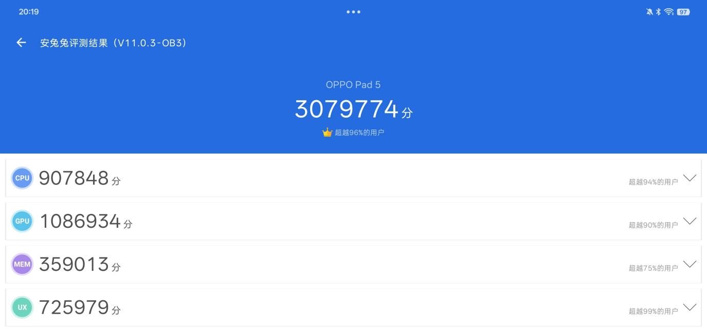 作为“性能板王”,OPPO Pad 5的核心配置毫不含糊 —— 搭载同档唯一的天玑9400+旗舰芯片,采用3nm制程与全大核架构,实测安兔兔跑分直接突破307万,这样的性能水准,即便放在旗舰级平板中也毫不逊色。