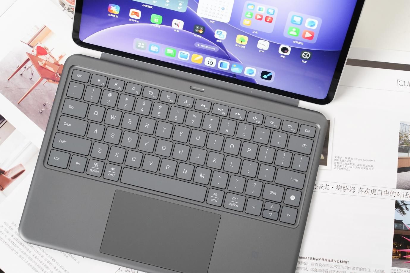 搭配同色系智能触控键盘与手写笔,OPPO Pad 5还能“秒变笔记本电脑”。键盘采用14.5*14.5 标准键帽,键程长达1.5mm,打字手感接近传统笔记本,长时间写作业、写报告也不会觉得累;键盘上的独立AI按键,能快速唤醒小布助手,语音查询知识点、设置提醒都很便捷。