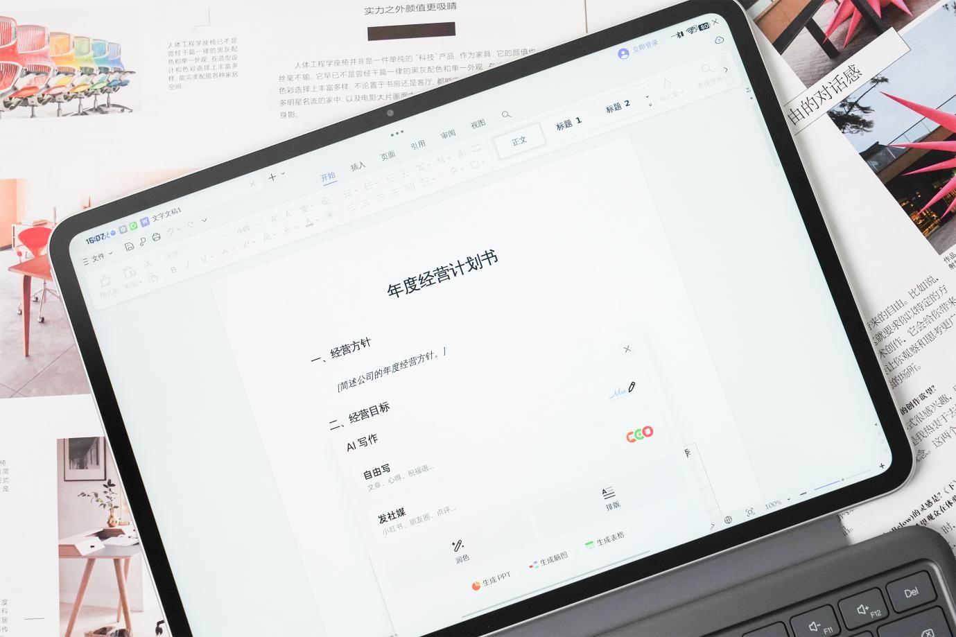最让人惊喜的是“AI 一键生成内容”功能:在PC级WPS中唤起键盘,点击左上角“彩色铅笔”图标,就能一键生成PPT、思维导图、小红书文案——以往做课程汇报PPT,要花几小时找模板、排版;但用OPPO Pad 5,输入“大学生创新创业大赛 PPT”关键词,系统就能自动生成结构完整、排版精美的PPT,稍作修改就能使用,极大节省了时间。