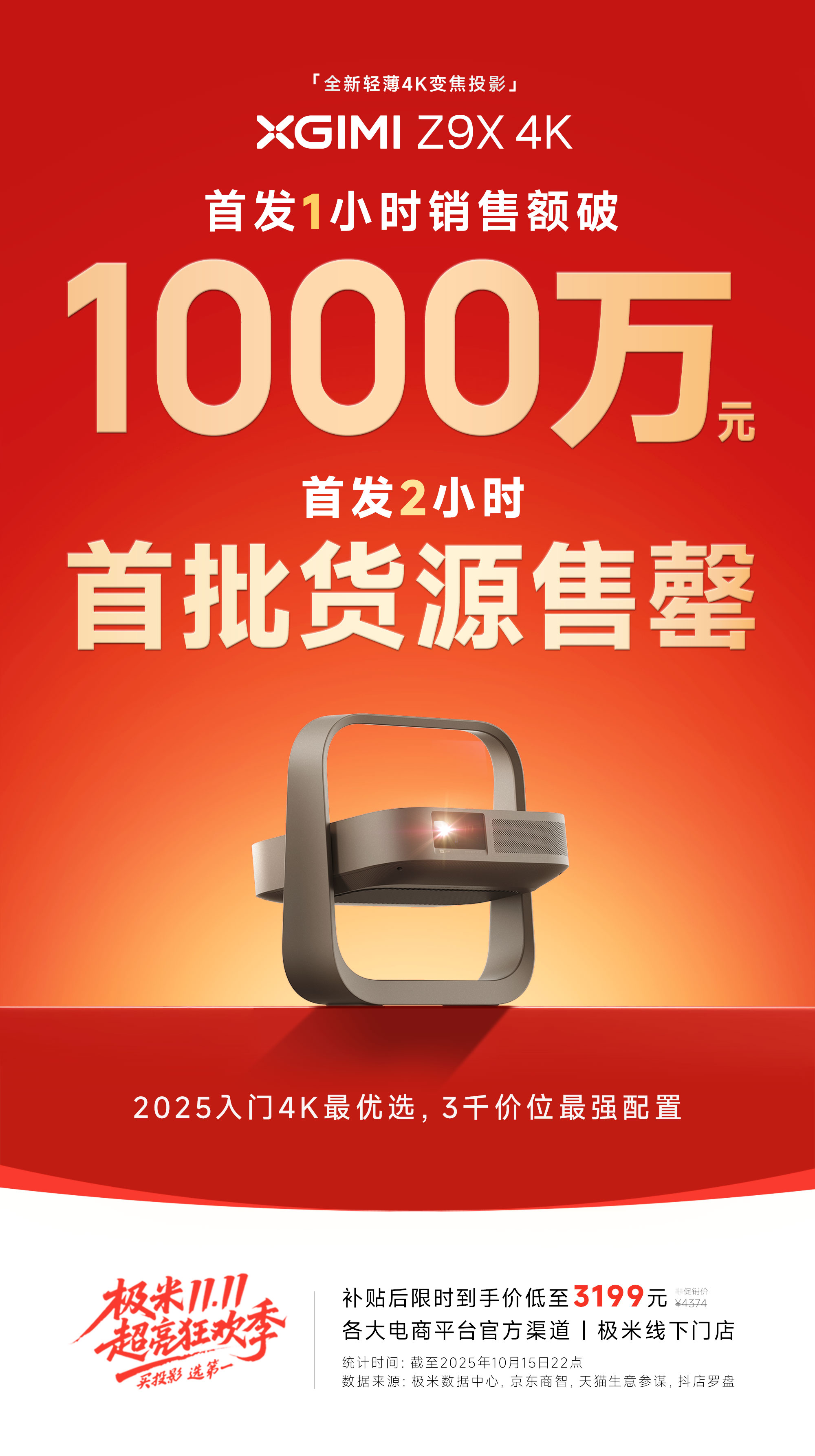10月15日晚八点,全新轻薄4K变焦投影极米 Z9X 4K 全平台现货开售,销售势头强劲,一经上线便迅速获得市场认可。首发一小时全渠道销售额破1000万元,首发两小时,首批货源全部售罄,再次印证了极米作为全球家用投影品牌TOP1的市场认可度!