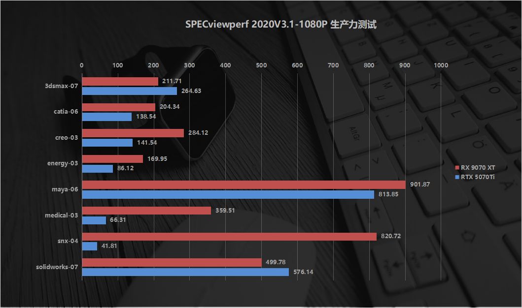 接下来进行的是SPECviewperf 2020测试。该软件是基于OpenGL API的专业显卡性能评估工具,核心用于衡量硬件在3D渲染、建模等复杂图形应用中的实际表现。它的测试原理是模拟专业软件中的用户交互操作,覆盖3ds Max、Maya、CATIA、SolidWorks等主流设计与建模软件场景,以此量化显卡性能。从最终对比成绩来看,RX 9070 XT呈现断崖式领先优势。尽管RTX 5070 Ti在3dsmax、solidworks两个测试项目的成绩上实现了小幅反超,但在绝大多数场景下,它都被RX 9070 XT以绝对性的优势超越,两者差距相差一倍都不算多,比较夸张的场景下,比如,对应计算机辅助设计、制造及工程分析(CAD/CAM/CAE)应用的snx-04场景,两款显卡性能差距可达十几倍。综合算下来,两者在生产力上的差距足足相差了42倍还多,只能说RX 9070 XT赢的彻彻底底。