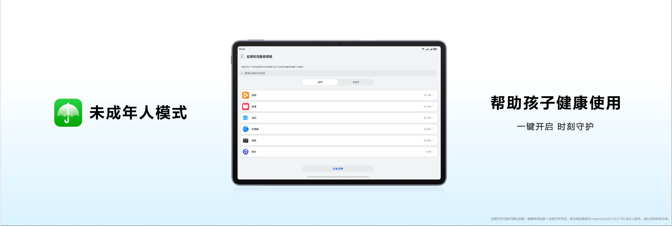 除了丰富的学习功能,华为MatePad 11.5还内置“未成年人模式”,辅助家长管理孩子的学习过程。该模式下,家长可统一管理屏幕使用时间、应用权限与内容访问,定制适合孩子的网络环境;更能通过“远程守护”功能,在手机端实时查看设备位置与状态,并远程完成各项设置,帮助孩子在自律中平衡学习与娱乐,实现健康成长。