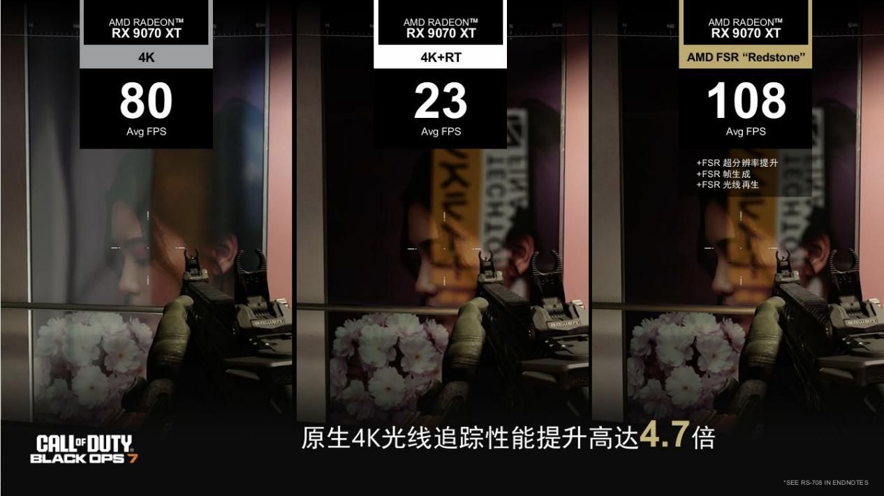 值得一提的是,FSR Redstone的光线再生功能通过神经网络降噪,有效解决了传统光追的颗粒感问题,《使命召唤:黑色行动7》的实机测试中,墙壁反射、物体阴影的边缘清晰度媲美原生光追,且帧率提升幅度达到4.7倍,让RX 9070 GRE的光追体验实现了从“能用”到“好用”的跨越。