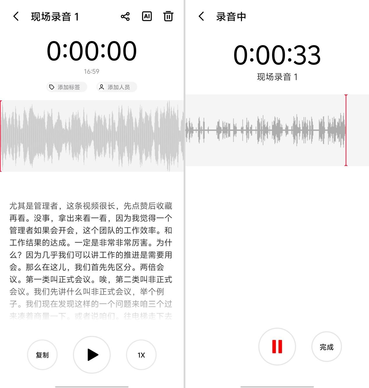 会议场景下更实用,双击AI键就能启动录音转写,准确率能达到95%以上,还能自动生成会议纪要和待办事项,后续整理起来特别方便。