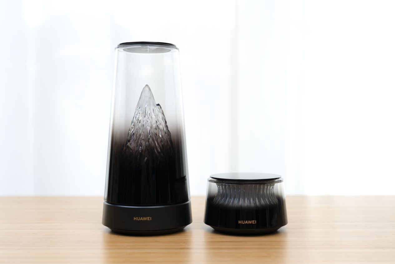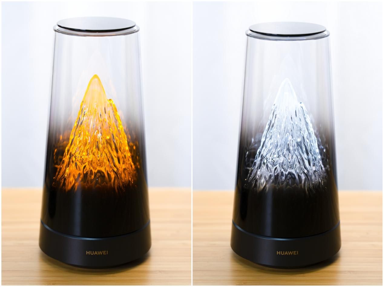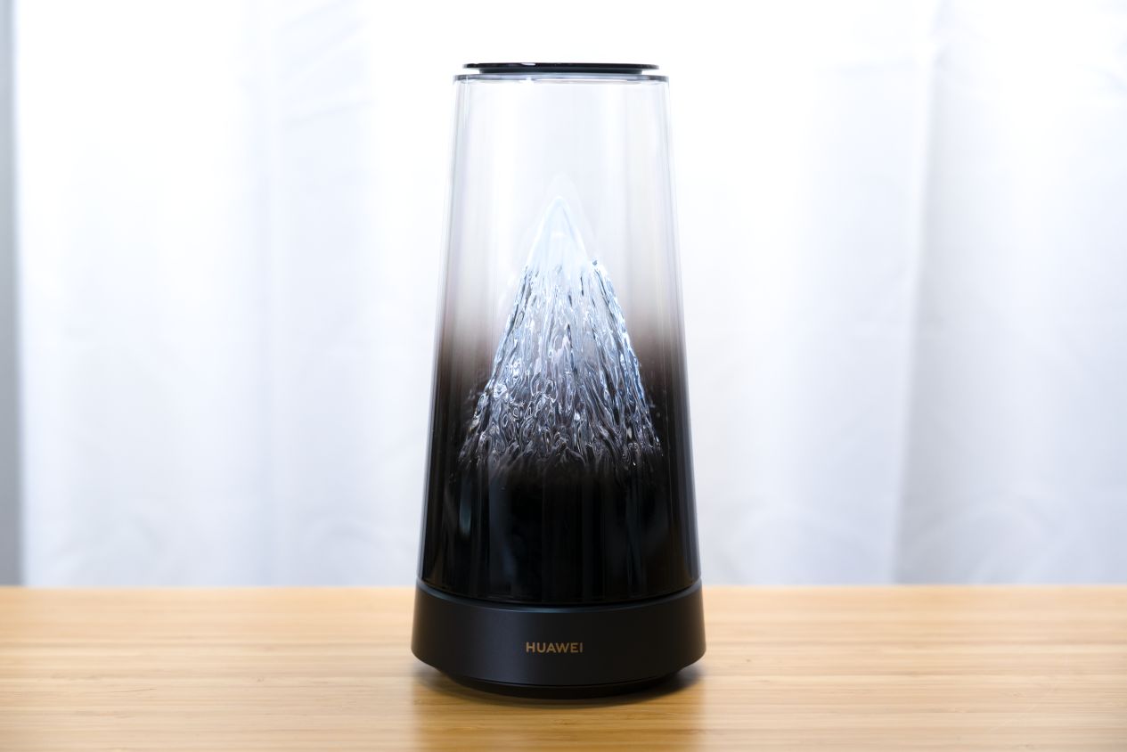 其实单看外观的话,你确实很难将它和路由器联系在一起。整个圆柱形的机身,上半部分透明渐变的山峦形态,据说是经由500多到复杂曲才雕刻出来的雪山造型,很像是一台精致微缩的床头摆件。